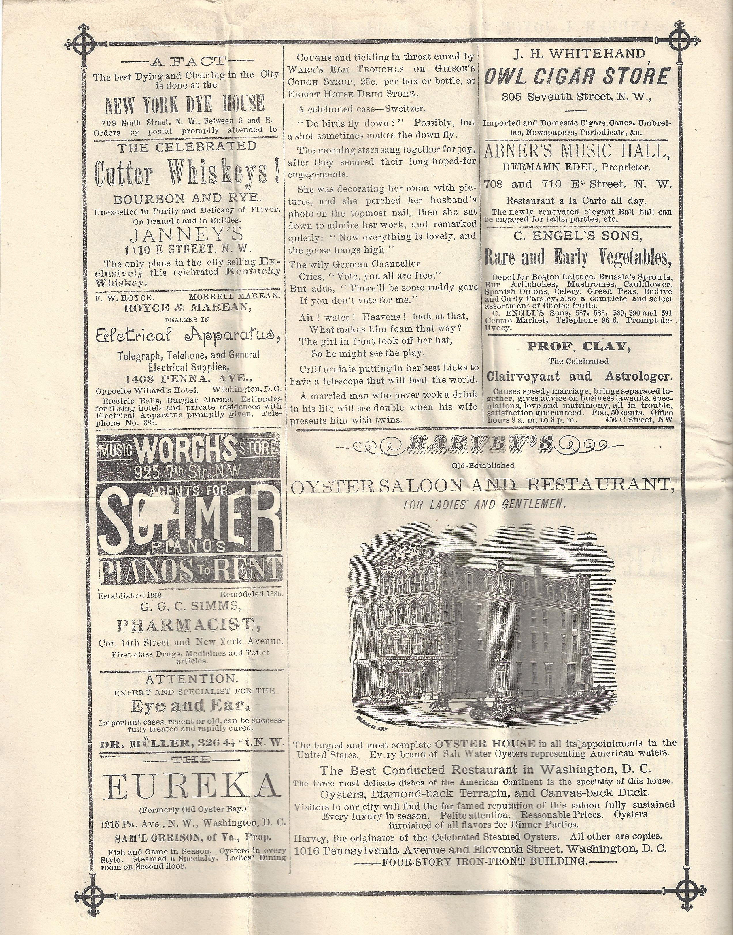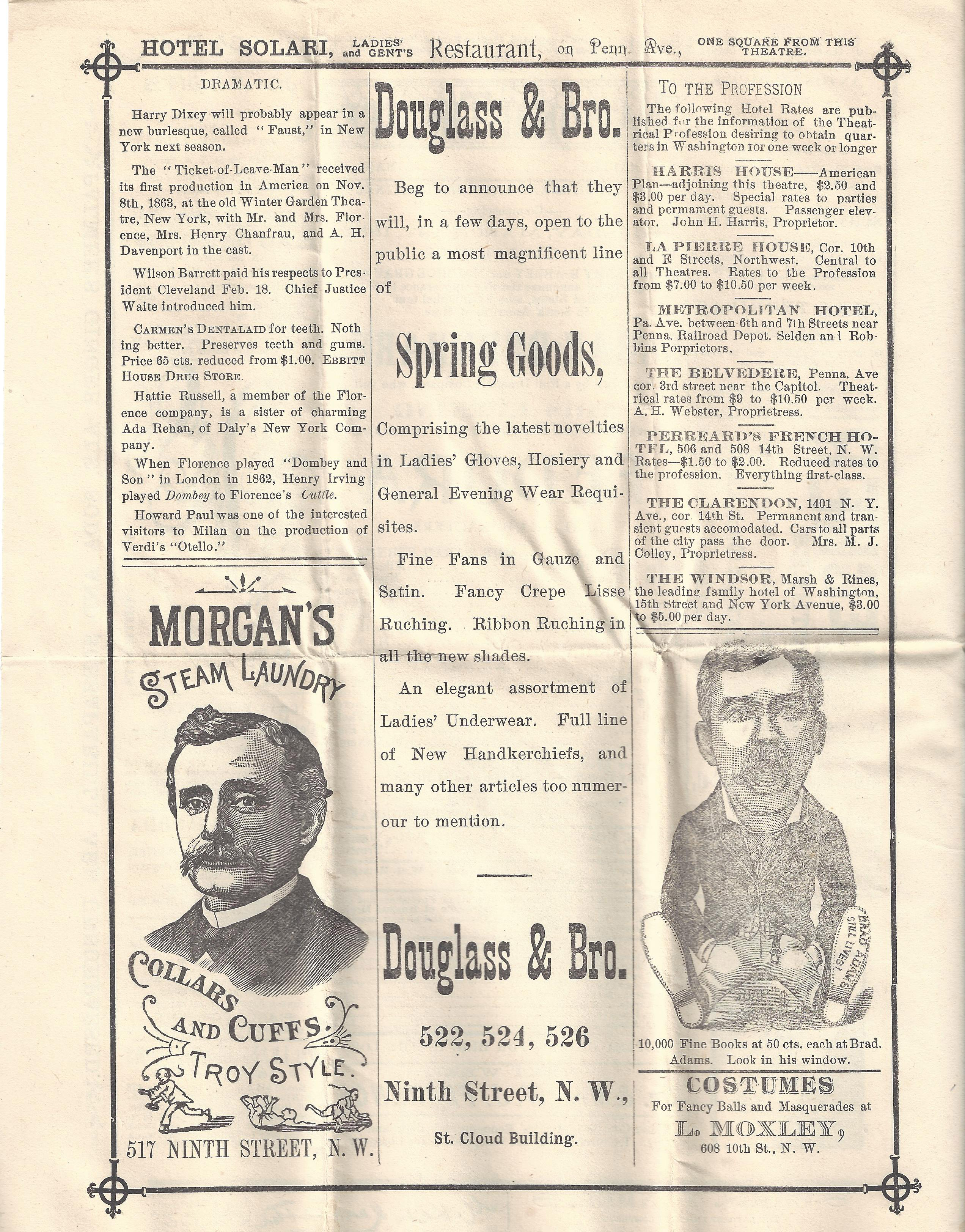 Like Jenny Lind before her, excitement for Bernhardt’s American 1881 debut was high. Unlike Lind, who was renowned for being kind and demure, Bernhardt’s had a famously salacious reputation, driven in part by rumors of her extravagant lifestyle, peculiar ways, and promiscuity (she was already traveling with an illegitimate son). Despite, or perhaps because of this, Bernhardt’s arrival was greeted by huge crowds, and her work on the stage was praised by critics for its ease and naturalism in comparison to the bombastic American acting of the day. Naturally, Bernhardt’s extensive touring brought her to Washington, where she was a consistent hit at The National Theatre. Her first appearance came in her inaugural American tour of 1881, in which she performed leading roles in Camille and Frou-Frou. After the immediate success of her first tour, Bernhardt returned to The National on four more occasions between 1887 and 1916, always flexing her dramatic talents by playing multiple shows in repertory (when one cast performs multiple plays on alternating nights), including favorites La Dame aux Camelias and Cyrano de Bergerac. It’s worth noting, too, as Robert Gottlieb does in his biography Sarah, that Bernhardt’s first touring repertoire included six death scenes out of eight total plays, suggesting a flair for the dramatic and an astute understanding of the sort of drama audiences craved.